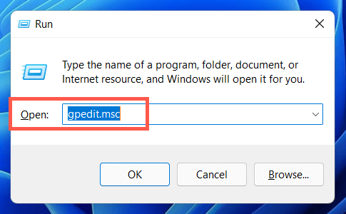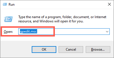 - Type gpedit.msc into a Run box and press Enter.