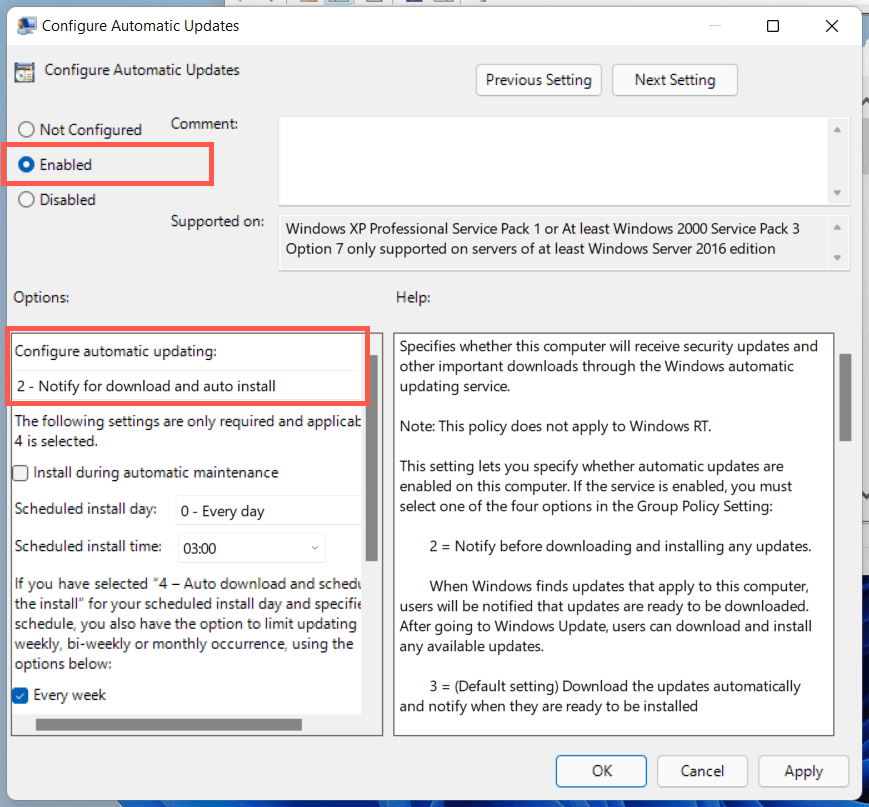 - Select Enabled. * Open the pull-down menu under Configure automatic updating and select 2 – Notify for download and auto install option.