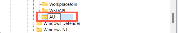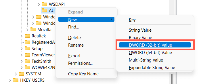 - Right-click the AU key and select New > DWORD (32-bit) Value.