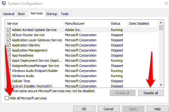 - Select **Hide all Microsoft Services** under the **Services** tab and select **Disable all**.
