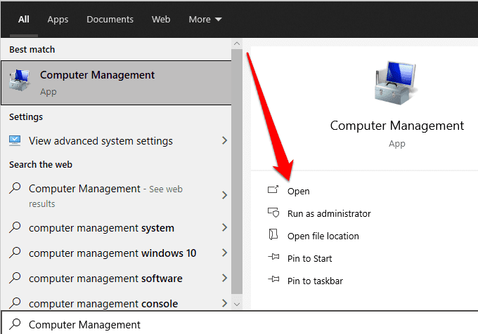 - Type Computer Management in the search box on the taskbar and select **Open **under Computer Management in the search results.