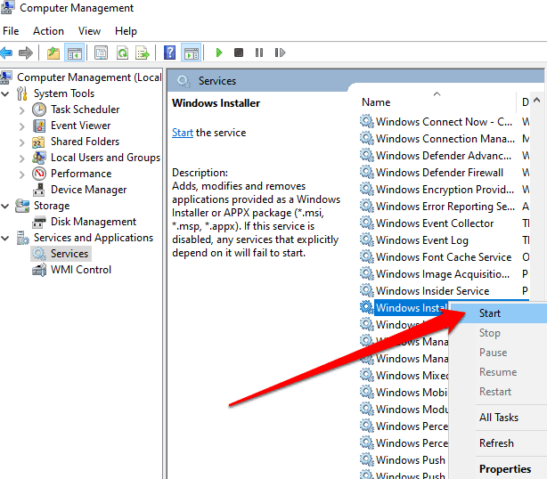 - Right-click on **Windows Installer** in the details pane and then select **Start**.