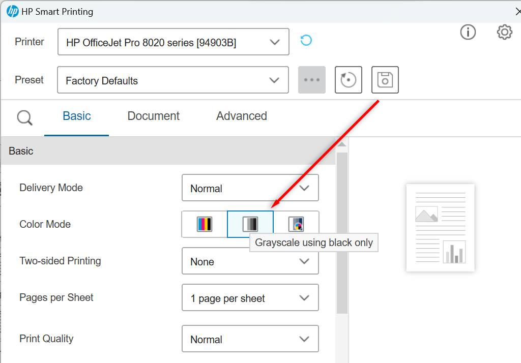 - When the Printer Properties opens, choose the Quick Setup tab and tick the checkbox next to the Grayscale Printing color option. If this printing option isn’t here, check for similar settings. For example, for HP Smart Printing, it’s under Basic > Color Mode.