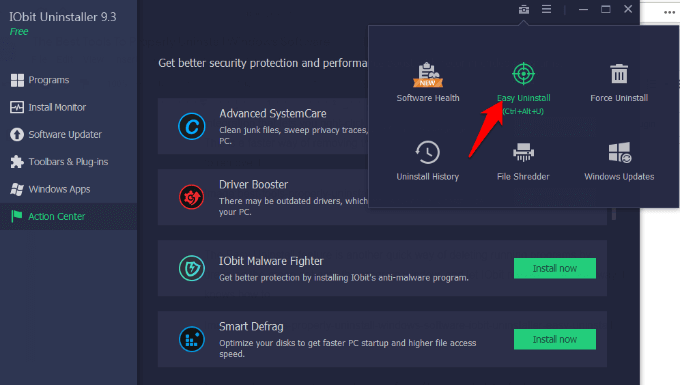 The Easy Uninstall feature is another quick way of deleting running programs by dragging the green dot onto the program window, and let IObit remove it the best way it knows how to.