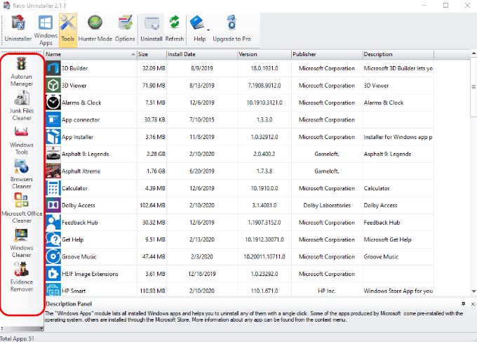 It also has a Hidden option that shows programs that can only be forcefully removed by eliminating any references to them in the file and registry system, and a few extra tools like a task scheduler. All these are packed into a file less than 10MB in size.