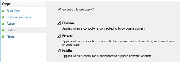 Finally, choose which profiles you want the rule to apply too. It’s probably a good idea to just pick all the profiles.