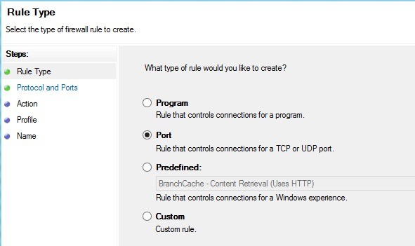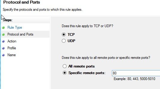 I chose port because I want to block all outgoing connections on port 80, the HTTP port used by every web browser. In theory, this should block all Internet access in IE, Edge, Chrome and other browsers. Click Next, select** TCP** and type in the port number.