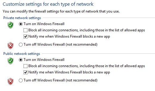 If you go back to the Firewall home dialog, there is another link on the left-hand pane called Turn Windows Firewall On or Off. If you click on that, you’ll get a set of options like shown below: