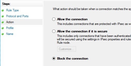 Click Next and choose the action you want to perform, in my case,** Block the connection**.