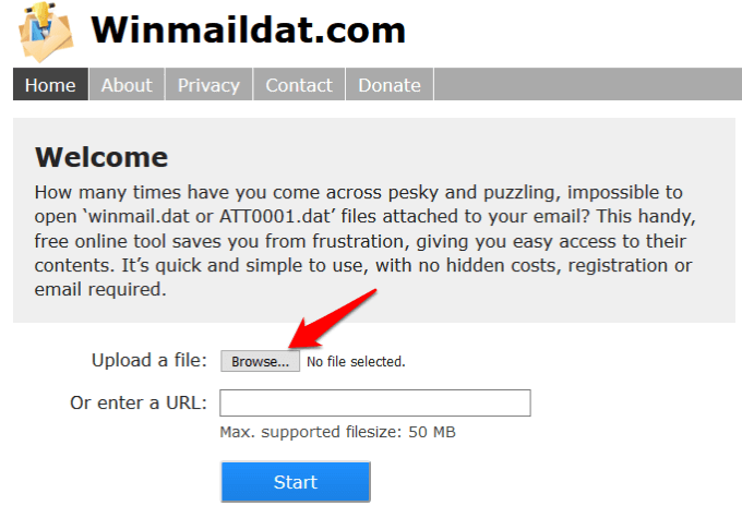 If you received an email attachment in the form of a winmail.dat file, you can easily open it using Winmaildat.com without the sender having to resend it to you in the mail. Once you download the .dat file attachment, go to Winmaildat.com and click **Browse **next to Upload a File.