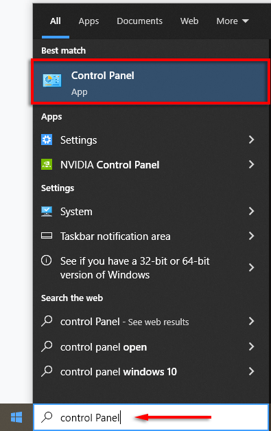 - Open the **Start Menu **and type Control Panel. Select it.