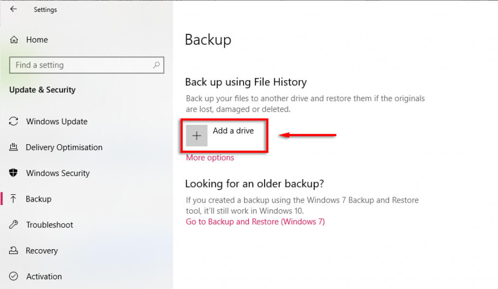 - Open **Settings** > **Windows & Security **> **Backup** as above. * Select **Add a drive** and reconnect your drive to File History.