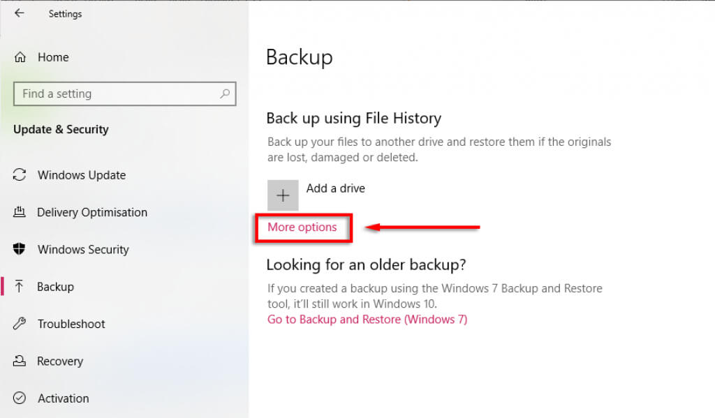 - Open **Settings** > **Windows & Security **> **Backup** as above. * Click **More options**.