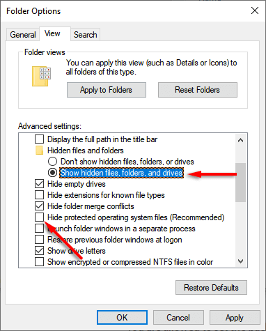 - In the **Advanced settings **pane, ensure that **Show hidden files, folders, and drives** is checked and **Hide protected operating system files (Recommended) **is unchecked.