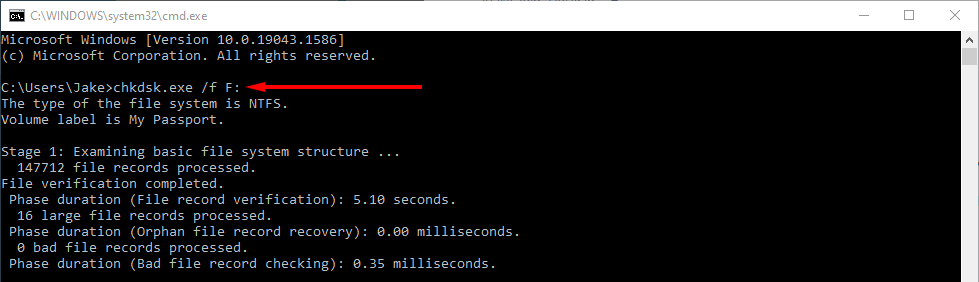 - In the command prompt window, type **chkdsk.exe /f E: **(replacing “E” with the drive letter of the one you are attempting to fix).