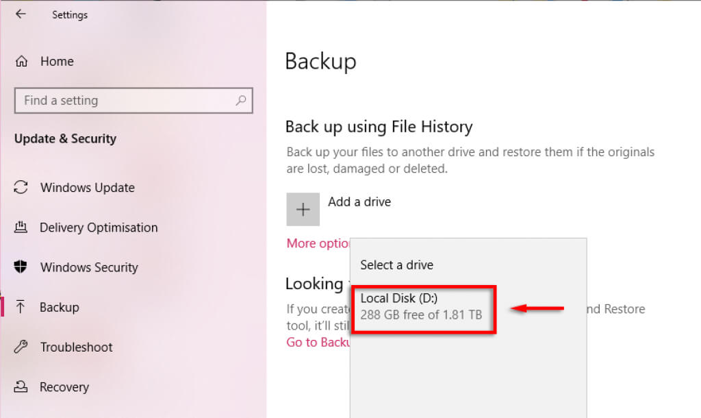 - Go back to the File History settings and click **Add a drive**.