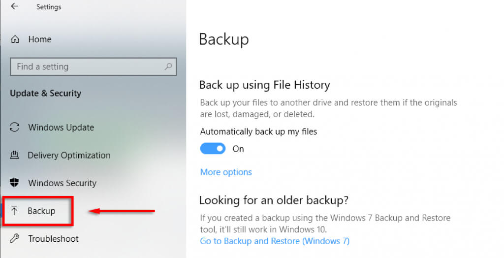 - Open Settings > **Windows & Security **> Backup as above.