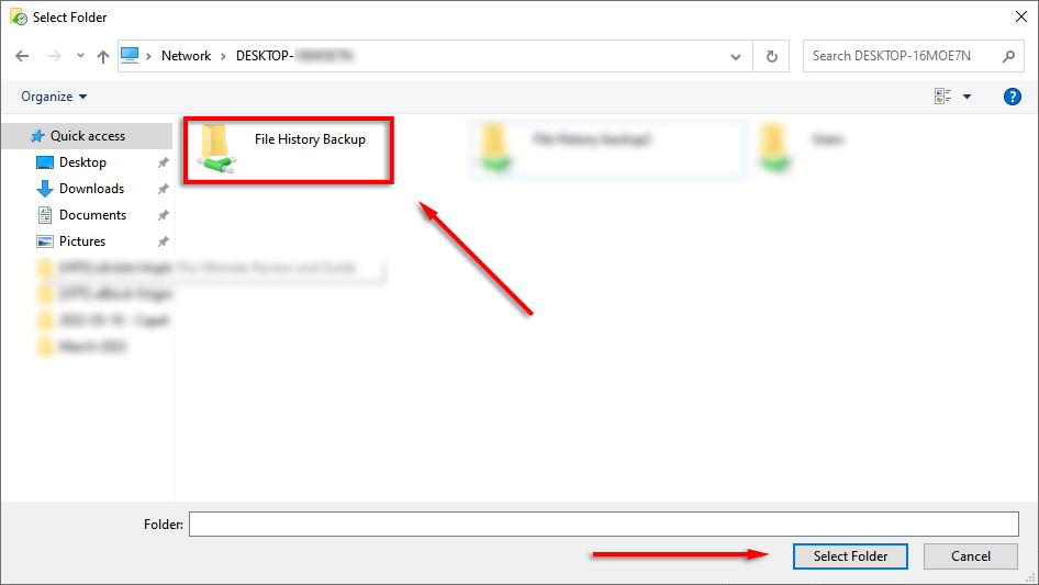 - Highlight the File History Backup folder and click **Select Folder**.