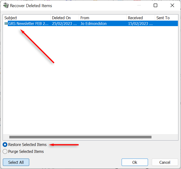 - In the Recover Deleted Items window, select the items that you want to recover, hold the Ctrl key and select your items if there are multiple. Make sure Restore Selected Items (or Recover Deleted Items depending on your Outlook version) is selected, and then select OK.