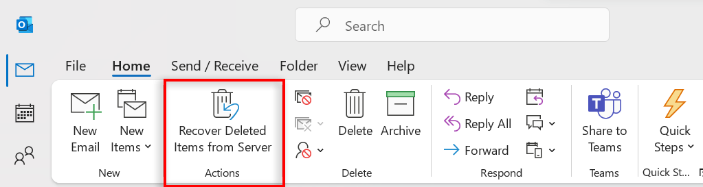 - In the Home/Foldertab, click Recover Deleted Items from Server. If there’s no “Recover Deleted Items from Server” button on the menu, your account doesn’t support recovering an item that’s no longer in your Deleted Items folder.