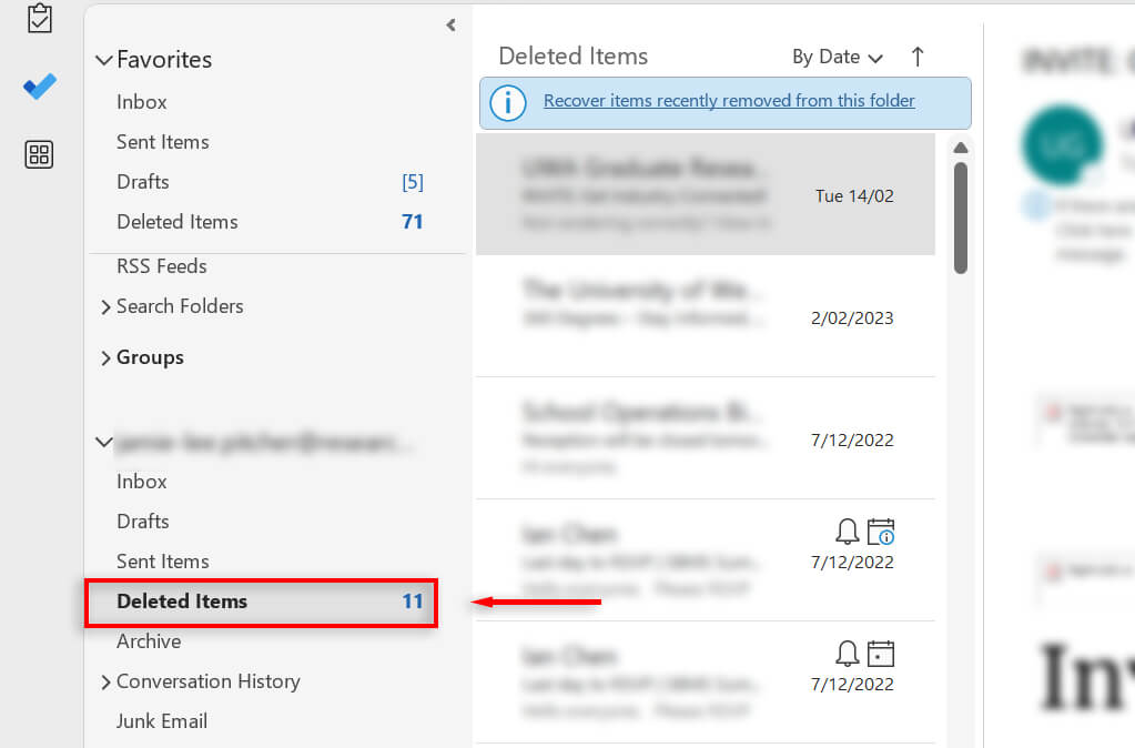- On the left-hand side, open the Deleted Itemsfolder.