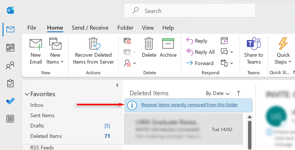 Note: You may also see an option called “Recover items recently removed from this folder” when entering the Deleted Items folder. If the above option isn’t available, check for this and select it to try recovering deleted emails.