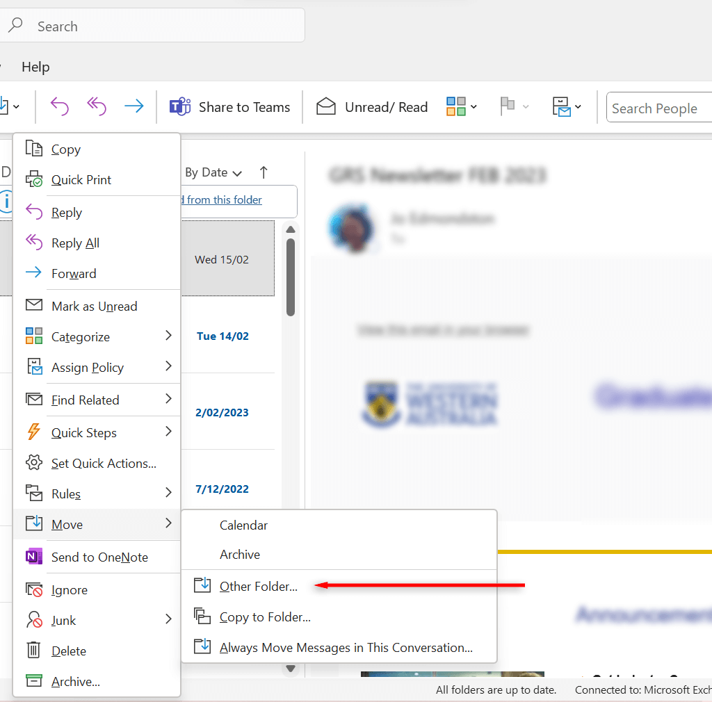 - Look for the deleted email or deleted Outlook folder. Right-click the deleted item and select Move and Other Folder.