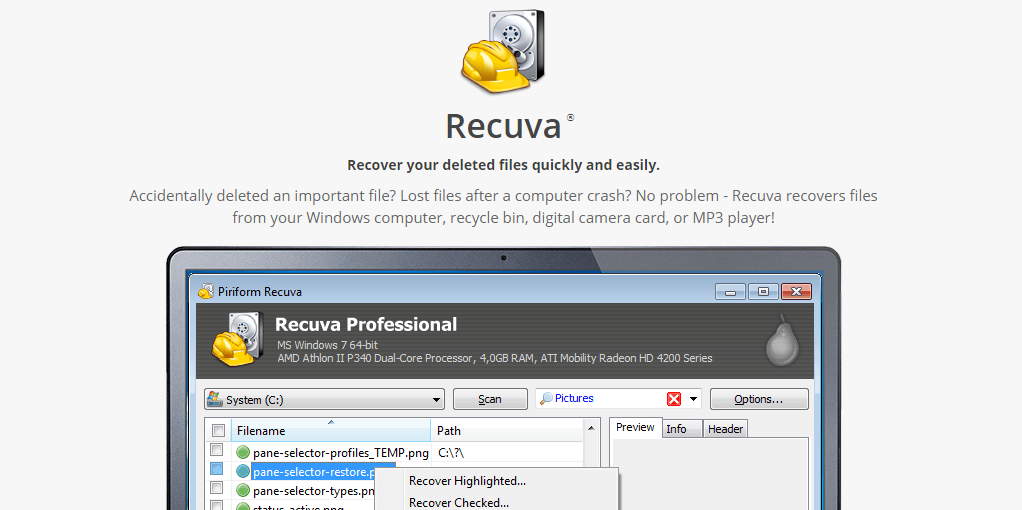 The free version will work for most situations. It supports recovering most file types and most media such as memory cards, USB flash drives, and external drives. The professional version also supports file recovery with virtual hard drives and comes with automatic updates and support. Pretty good for about $20. If you feel that Recuva isn’t quite thorough enough, take a look at Disk Drill.