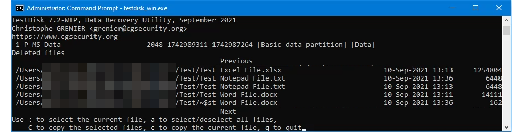 Although TestDisk is run from the command line, it was easier to use than we thought. There’s good documentation on how to recover files with TestDisk on their site. TestDisk seemed to list every file ever deleted from the drive, and we had to scroll through them for a long time to find the test files. It was scary how in-depth the scan was. Names of files deleted in 2011 were shown.