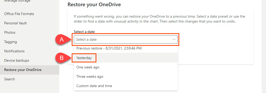 - If the code is correct, the **Restore your OneDrive** page loads. * Choose the **Select a date **dropdown box * Select how far back to go with the OneDrive restore