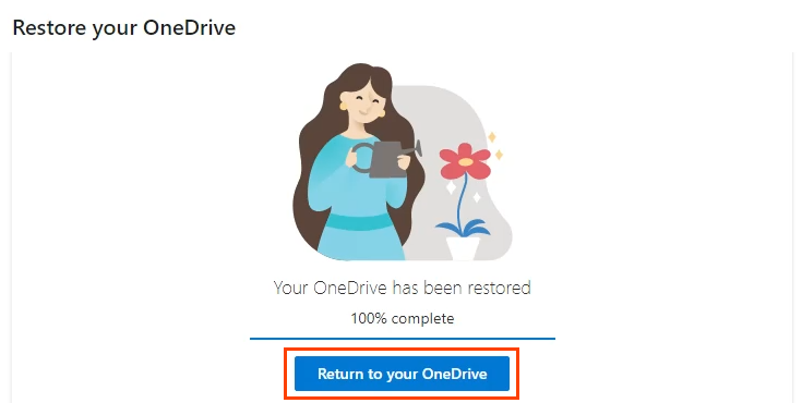 - OneDrive will begin restoring to the point chosen. How long the restoration takes depends on the size of the OneDrive. Once the restoration is complete, select **Return to your OneDrive **to go see the accidentally deleted file or folder.
