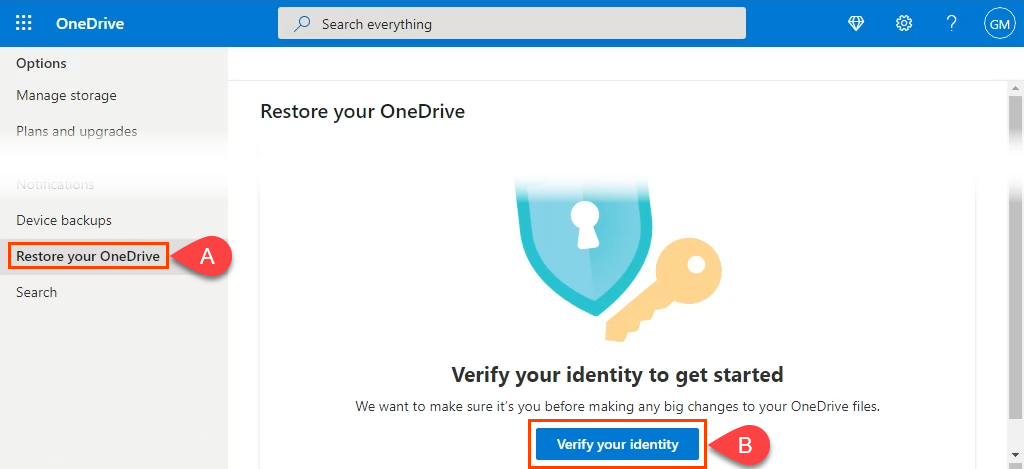 - On the new page: * Select **Restore your OneDrive** * Select **Verify your identity**