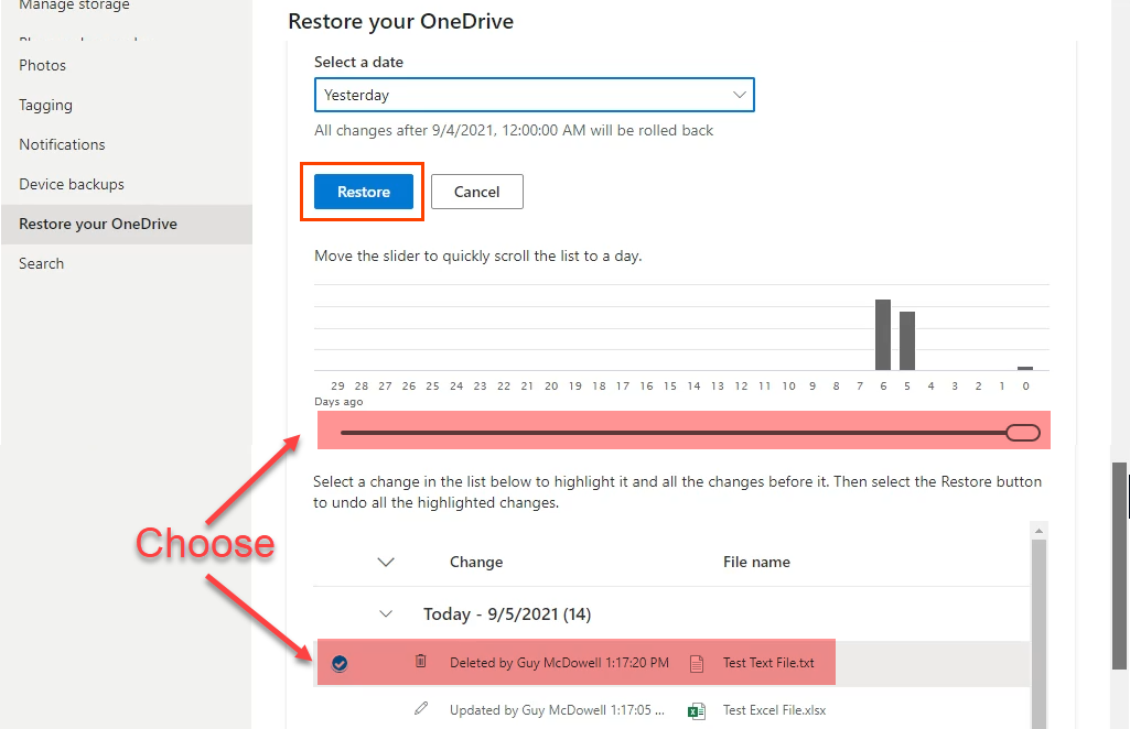 - The **Restore Your OneDrive** page reloads with the option to be more specific. Choose either to: * Move the slider to a previous day based on the activity level on that day * Select a specific change event. If the 4th specific event was chosen, then events 1, 2, and 3 are included in the restoration.
