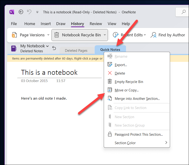 - With the recycle bin enabled, you’ll see a list of pages and sections that were deleted in the past 60 days as tabs—click any of them to view the deleted information. * To restore any of these notes to your notebook, right-click the tab of the deleted content and press Move or Copy (or Merge into Another Section instead).