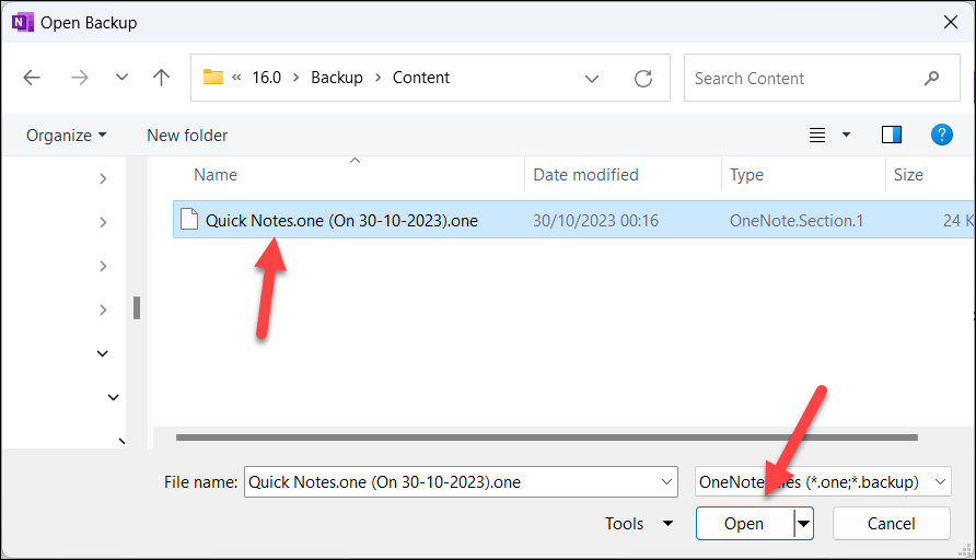 - Once you select the restored notebook file, OneNote will open it for you to view immediately.