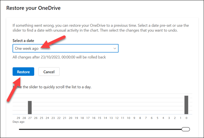 - Once you’ve verified your access, select a time period to view any changes you’ve made within the past 30 days from the Select a date drop-down menu. * You’ll see a list of changes below. These will be automatically selected or, if you’ve selected Customized date and time, you’ll need to select them manually. Look out for the name of your deleted OneNote notebook file in the .one file format and make sure that it’s selected. * Once the changes are selected, press the Restore button at the top of the page.