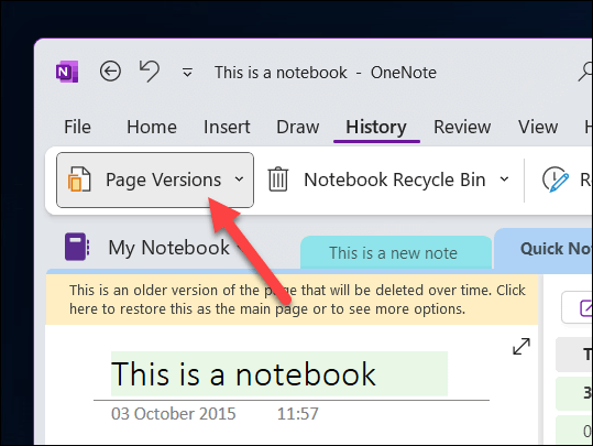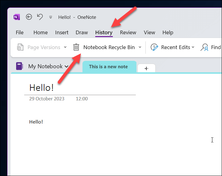 - Press the History tab on the ribbon bar and select the Notebook Recycle Bin button.