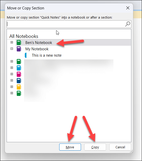 - Choose the notebook and section you want to restore it to and press Move or Copy. This doesn’t need to be the same notebook that the notes originally came from.