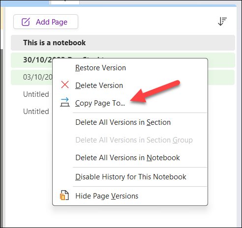 - You can also right-click a version of the page and press the Copy Page To option to make a new copy of that version of your page and store it alongside your main copy.