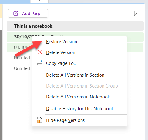 - If you want to restore the older page permanently, right-click the older version of the page you want to restore and press the Restore Version option. This will restore that version of your page as the main version in your notebook.