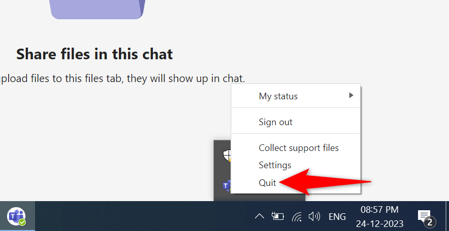 - Right-click Teams in the system tray and choose Quit.