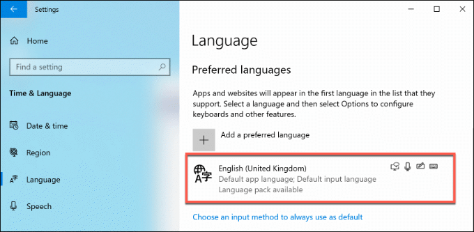 You can check this by right-clicking the Windows Start menu and clicking **Settings. **From here, click Time & Language > Language and check the locale listed under the Preferred Languages section.