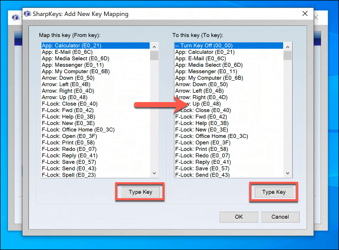 - In the Add New Key Mapping window, you can select which keys you want to map. You map the key choices from the left-hand list to the physical keys listed in the right-hand list. You can scroll through and select these manually, or click the Type Key button under each section to find them automatically. Press OK when you’ve completed your key mapping.