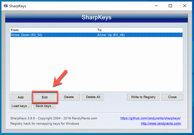 - You can repeat the above step to map multiple keys. To edit any of the choices you’ve made, select them from the list in the SharpKeys main menu, then press the Edit button.