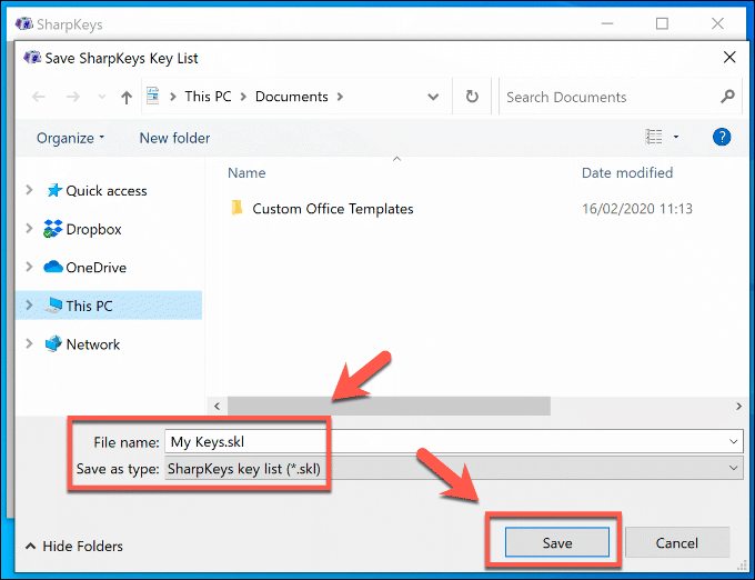- In the Save SharpKeys Key List window, select a suitable location to save your SharpKeys configuration file. Give it a memorable name, then press Save to save the file.