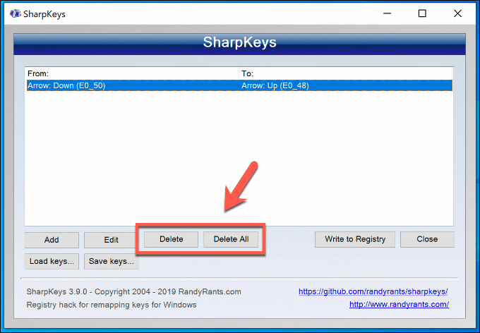 - Select an item and press the Delete button to remove that particular key mapping from your SharpKeys list. To remove all your key mappings at once, press the Delete All button instead.