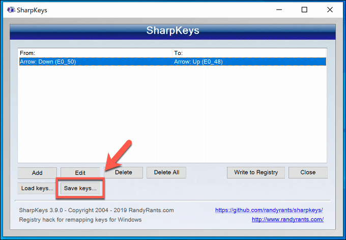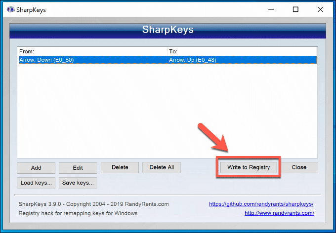 - The key mappings you create, edit, or delete using SharpKeys won’t apply until you write them to the registry. To do that, press the Write to Registry button in the main SharpKeys window.