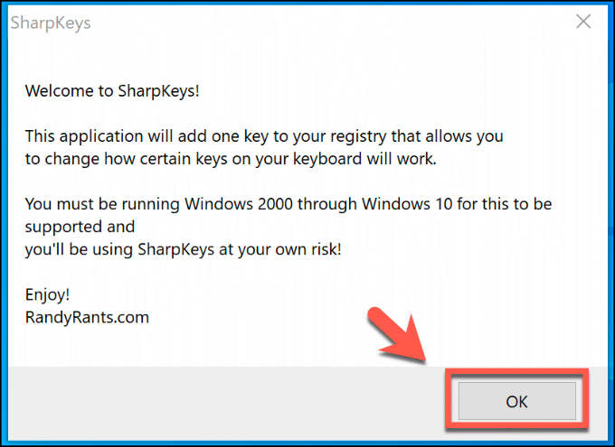 - Once SharpKeys is installed, open it from your Windows Start menu or run the executable file from the extracted folder for the portable version. SharpKeys will warn you that using it will modify the registry, adding a single key to it to remap your keys. Press OK to accept the warning and allow SharpKeys to do this.