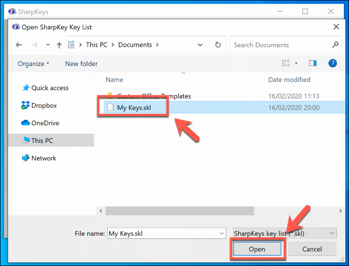 - Locate your SharpKeys configuration file in the Open SharpKeys Key List window and select it. Press Open to load the configuration file and add the new keys to SharpKeys.
