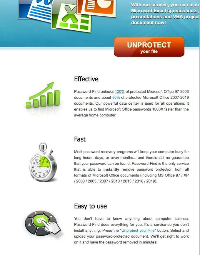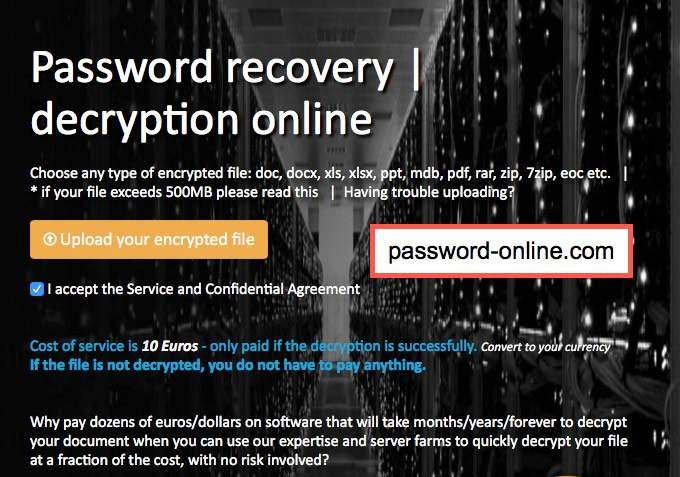 The final online option is password-online.com. When you visit the site, you will see Excel Password Recovery Online in the menu bar above. It appears that they have a one-size-fits-all, one step process.